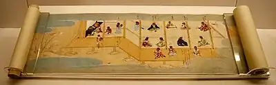 Historian and author Haga Kōshirō points out that it is clear from the teachings of Sen no Rikyū recorded in the Nanpō roku that the suitability of any particular scroll for a tea gathering depends not only on the subject of the writing itself but also on the virtue of the writer. Haga points out that Rikyū preferred to hang bokuseki ("ink traces"), the calligraphy of Zen Buddhist priests, in the tea room.[22] A typical example of a hanging scroll in a tea room might have the kanji wa-kei-sei-jaku (和敬清寂, "harmony", "respect", "purity" and "tranquility"), expressing the four key principles of the Way of Tea. Some contain only a single character; in summer, kaze (, "wind") would be appropriate. Hanging scrolls that feature a painting instead of calligraphy, or a combination of both, are also used. Scrolls are sometimes placed in the waiting room as well.
