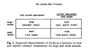 The Jarman–Bell Principle implies that the food quality a herbivore consumes is inversely proportional to the size of the herbivore, but the quantity of such food is proportional.[6] The principle relies on the allometric (non-linear) scaling of size and energy requirement.