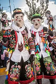 The cultural life in the city is vibrant, with many festivals and social and religious events taking place throughout the year. The most popular festival is the Feast of San Sebastian and San Fabian (20 January) when Tunantada is celebrated for one week. Tunantada derives from the Spanish 'Tunantes'. Some believe that the origin of the dance lies at the end of the Viceroyalty of Peru and the dawn of the Republican era of Peru. Through this dance of the festival, the natives imitate the Spanish, commemorating the years that the Spanish and natives existed alongside in Jauja.[22] Locals dress up in the form of satirical wire mesh masks, eyes, whiskers and painted white complexion. Some of the dancers carry a baton and wear their pants to the knee, as if they were pure-blooded Spanish. The music initially starts with violin sounds, and then the sounds of clarinets, Andean harps, saxophones, etc.