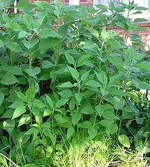 Jerusalem artichoke can propagate with seeds and tubers but the use of tubers leads to higher yields.[39] For planting, the tubers are cut into pieces with three to five buds[40] that are placed in 5–10 cm depth in the soil.[41][42][43] Jerusalem artichoke has low nutrient requirements and needs less nitrogen than other energy crops.[44] The competitiveness against weeds is high, making weed control easier but also making it harder to grow a different culture afterward, since usually small pieces of tubers remain in the ground after harvest.[45] The plant's high competitiveness may be due to allelopathic effects,[46] high plant size,[47] and rapid growth rate.[48]
