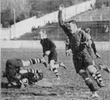 In March he was elected on to the committee of the Devonport United committee at their annual meeting with "about 100 members" in attendance.[86] In their opening match of the season on 24 April against Ponsonby they had several injuries and were only left with three forwards, namely O'Brien, Neville St George, and Horace Dixon.[87] O'Brien and Dixon were "always on the ball", and if not for the injuries may have won the match.[88] In round 4 against Grafton Athletic he was part of a forward pack that "broke away time after time with O'Brien putting in great work".[89] In round 8 he scored in a loss to Ponsonby (19–16) after Cleaver kicked high and the ball struck the goal posts and rebounded into O'Brien's hands.[90][91] The Auckland Star said that he and teammate Ernest Ruby, "were in the thick of everything".[92]