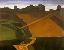 Mainly a landscape painter, his style can be considered as neo-figurative although his synthesis of forms leads a considerable abstract approach to nature depiction. He employed a bold style, often using strong shades of green, browns and grey, in producing mainly urban landscapes, as well as abstract still-life work. His landscapes were always meditative and silent with an "earthy" feeling within it (often only one quarter of the painting is occupied by the sky) using for example in his preparatory studies close-up photographs of particular rocks that would later form mountains or rocky landscapes.[1]