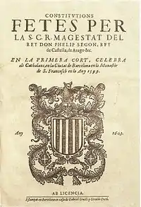 In 1599, the King Philip III of Spain attended a session at the Catalan Courts. Terès, still archbishop, presided the ecclesiastical arm.[7][25] After every session, the agreements achieved were usually printed, but that time there were five articles with which the deputies could not come to an agreement. Among them, the right of the viceroy to make proclamations and the deprivation for nobles and their servants of carrying petronels, in order to suppress banditry in Catalonia.[2]