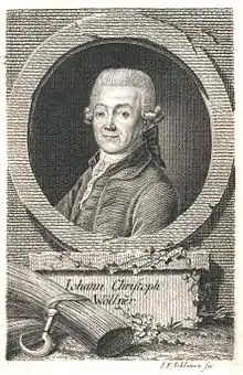 Wöllner, whom Frederick the Great had described as a "treacherous and intriguing priest," had started life as a poor tutor in the family of General August Frederick von Itzenplitz, a noble of the Margraviate of Brandenburg. After the general's death and to the scandal of king and nobility, he married the general's daughter, and with his mother-in-law's assistance settled down on a small estate. By his practical experiments and writings he gained a considerable reputation as an economist; but his ambition was not content with this, and he sought to extend his influence by joining first the Freemasons and afterwards the Rosicrucians. Wöllner, with his impressive personality and easy if superficial eloquence, was just the man to lead a movement of this kind. Under his influence the order spread rapidly, and he soon found himself the supreme director (Oberhauptdirektor) of several circles, which included in their membership princes, officers and high officials. As a Rosicrucian Wöllner dabbled in alchemy and other mystic arts, but he was also zealous for Christian orthodoxy as well as the Enlightenment concept of religion as an important factor in maintaining public order.[1] A few months before Frederick II's death, Wöllner wrote to his friend the Rosicrucian Johann Rudolph von Bischoffswerder (1741–1803) that his highest ambition was to be placed at the head of the religious department of the state as an unworthy instrument in the hand of Ormesus (the prince of Prussia's Rosicrucian name) "for the purpose of saving millions of souls from perdition and bringing back the whole country to the faith of Jesus Christ."