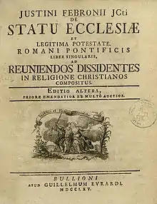 It is, however, as Febronius that Hontheim is best remembered. His 1763 treatise "On the State of the Church and the Legitimate Power of the Roman Pontiff" offered Europe the "foremost formulation of the arguments against papal absolutism in Germany".[3] The author of the book was known at Rome almost as soon as it was published; but it was not until some years afterwards (1778) that he was called on to retract. Threatened with excommunication and faced by the prospect of his relations' loss of their offices, Hontheim, after much vacillation and correspondence, signed a submission which was accepted at Rome as satisfactory. The removal of the censure followed (1781) when Hontheim published in Frankfurt what purported to be a proof that his submission had been made of his own free will (Justini Febronii acti commentarius in suam retractationem, etc.). This book, however, which carefully avoided all the most burning questions, rather tended to show – as indeed his correspondence proves – that Hontheim had not essentially shifted his opinion.[2]
