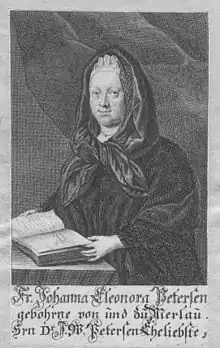 Johanna Eleonora Petersen (née von Merlau; 1644–1724) was a German theological writer and one of the leading figures of Radical Pietism. From 1680, she was married to Johann Wilhelm Petersen.[1]