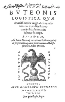 Buteo was born in Dauphine or possibly Charpey and belonged to the order of St. Anthony. He studied under Oronce Fine and wrote on geometry and [1] exposed Fine publishing a few books Opera Geometrica (1554), Logistica (1559), De quadratura circuli libri duo (1559). He died in a cloister about 1560-64 but some sources suggest he died in Canar in 1572. His contributions included a systematic way of eliminating unknowns in systems of linear equations which he demonstrated in Logistica with three equations and three unknowns.[2][3]