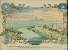 The Bricks on the southern bank of the Avon River. The second hut from the right belonged to Anderson. The inserts show the First Four Ships that landed the colonists in 1850. Painted by John Dury (third hut from the right) in 1851