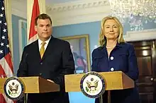 John Russell Baird PC (born May 26, 1969) is a retired Canadian politician. He served as Minister of Foreign Affairs from 2011 to 2015 in the cabinet of Prime Minister Stephen Harper. He had been a member of the federal cabinet, in various positions, since 2006. Previously he was a provincial cabinet minister in Ontario during the governments of Premiers Mike Harris and Ernie Eves. Baird resigned from Harper's cabinet on February 3, 2015,[1] and as a Member of Parliament on March 16, 2015.[2]