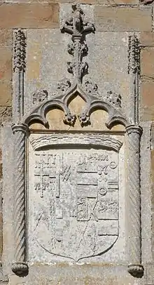 - Thirdly, on 4 December 1548, to Margaret Donnington[8][9] (died 1562) daughter and sole heiress of John Donnington (died 1544) of Stoke Newington, a member of the Worshipful Company of Salters,[10][11] by his wife Elizabeth Pye.[12] Margaret Donnington was the widow successively of Sir Thomas Kitson (died 1540), the builder of Hengrave Hall in Suffolk, and next of Sir Richard Long (died 1546) of Wiltshire, Great Saxham and Shingay, Cambridgeshire, Gentleman of the Privy Chamber to King Henry VIII. Margaret Donnington was a strong-minded lady who insisted that at the same time as her marriage to Bourchier, his son and heir should marry her own daughter Frances Kitson. The double marriage took place at Hengrave on 11 December 1548.[13] Thus the 2nd Earl's eldest son from his 2nd marriage to Eleanor Manners,[14] John Bourchier, Lord FitzWarin (who predeceased his father), married his own step-sister, Francesca Kitson, and was by her the father of William Bourchier, 3rd Earl of Bath. Margaret Donnington and Bourchier made Hengrave their home[15] and Bourchier was buried at Hengrave.[16] Stained glass in the cloister of Hengrave Hall survives memorialising the Bourchier residency, showing ten quarterings of Bourchier (Bourchier, Louvaine, FitzWarin, Audley, Cogan, Hankford, Stapledon,[17] Martin, Dinham, Arches) impaling Donnington (Argent, three pallets azure on a chief gules three bezants)[18]