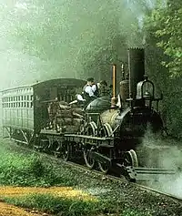 The John Bull was built in Newcastle, England, by Robert Stephenson and Company for the Camden and Amboy Railroad (C&A), the first railroad built in New Jersey.[2][5] It was dismantled and then shipped across the Atlantic Ocean in crates aboard the Allegheny.[3] C&A engineer Isaac Dripps reconstructed the locomotive to the best of his ability (the shipment did not include any drawings or instructions to assemble the locomotive) and ran it for the first time in September 1831.[6][7] On November 12, 1831, Robert Stevens (then president of the C&A) repaid some political debts by inviting several members of the New Jersey legislature and some local dignitaries, including Napoleon's nephew Prince Murat, for rides behind the newly delivered locomotive over a short test track. The prince's wife, Catherine Willis Gray, made a point of hurrying onto the train so she could be declared the first woman to ride a steam-powered train in America, though unknown to her, men and women had already ridden behind the steam powered maiden runs on the Baltimore and Ohio, South Carolina Railroad, and the Mohawk and Hudson by this point in 1831.[3][6][8][9]