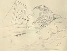 By dogged perseverance, he taught himself to draw and paint, and to such a great proficiency that belied his disability. He devoted himself mainly to line-drawing, and, with the help of an attendant to supply his materials, and a specially adapted desk, produced work of great beauty and thorough artistic finish in every detail. He was also able to write legibly using the same method.[1][6]