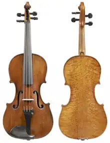 Delany's style of violin making evolved throughout his career. Some of his earlier instruments were based on the Stainer model and have a dull brown varnish and wide F-holes with exaggerated styling, typical of the early Irish school.[5] His later instruments were based on the Amati model, which his mentor, Perry, had adopted around the time of his apprenticeship. Perry is said to have studied directly from an Amati instrument lent to him by the Duke of Leinster.[17] It is possible that Delany was also influenced by Panormo's style during his time spent working at the Perry firm, which was also of the Amati school. Delany's later violins tend to have a lighter golden brown varnish, probably influenced by Perry's later 'golden amber' violins.[18][17] Delany branded his instruments externally 'DELANY/DUBLIN' at the back below the button, a signature of the Irish school.
