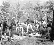 Hales heard firing in the paddock at the end of the hut. He ran out to the area and saw the bushrangers firing at King and Hall. The bushrangers kept up the fire as they got through a bush fence that led to the creek and took up position behind a large tree. Gilbert used his revolving rifle on Hales and Bright but it misfired. Meanwhile, King and Hall took up positions. Dunn and Gilbert started firing their revolvers at Hall and King, and ran down to the creek. Hales and Bright immediately fired at the bushrangers, at which time Gilbert was hit and killed instantly.