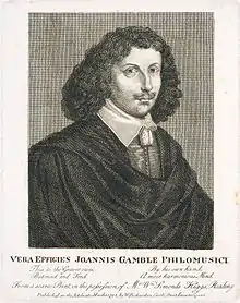 John Gamble (died 1687) was a composer and musician in the court of Charles I of England and Charles II of England. He worked in the King's Company on the stage prior to the English Civil War, and in 1641 he was hired by the Middle Temple. During the Interregnum, he taught music and performed, and 1661 he got a position in the King's wind band playing cornett. He lost all of his money in the Great Fire of London in 1666 (as money would have been in coin and stored in homes, therefore liable to melting). In 1674 and 1676, he got positions in two more royal bands, but he lost all of his positions with the rise of James II of England, and he died "crazed and infirm of body" (according to his will) in 1687.
