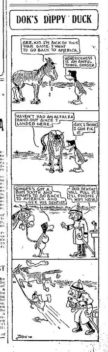 DOK's comic strip, Dok's Dippy Duck started out as a daily comic strip without a name, May 31, 1912.[6] In the early strip, the unnamed duck stood around on the street corner picking fights with whomever passed by.[6] Doc's duck became a traveler during World War I and the cartoons show him interacting with both sides of the conflict.[7] The duck in this cartoon is also known as The Kid.[8]