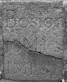 In 1823, the year of his death, John McLean placed mile markers[8] six through ten out from Boston to his birthplace, Milton, Massachusetts. His business partner, Isaac Davenport, completed the work after McLean's death and had McLean's name inscribed on the stones. As of 2016, the stones still exist.[9] John McLean died a wealthy and well-regarded man on October 23, 1823, leaving an estate of $228,120. His reputation at his death had matured to the point that it was said after his death, "Mr. McLean was a truly noble specimen of a Boston Merchant."[10]