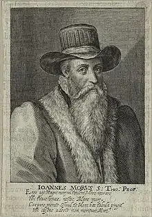 More died at Norwich, and was buried in the churchyard of St. Andrew's on 16 January 1592. He left a wife, afterwards married to Nicholas Bownde, and two daughters. He is said to have worn the longest and largest beard of his time, for which he gave as a reason 'that no act of his life might be unworthy of the gravity of his appearance.' Robert Greene is generally supposed to mean More's preaching in his account of the manner in which he was influenced by a sermon he heard in St. Andrew's Church, Norwich.[2]