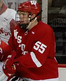 At the 2011 NHL Entry Draft, Ramage was selected in the fourth round, 103rd overall, by the Calgary Flames – one of his father's former teams.[8] He remained at Wisconsin, and in his sophomore season of 2010–11, scored 1 goal and added 10 assists.[3] Named the Badger's captain in his junior season of 2011–12, Ramage initially struggled and finished with only 10 points in 37 games.[1][6] Wanting to complete his degree and to continue to develop as a player, Ramage declined an opportunity to turn professional with the Flames and instead returned to Wisconsin for his senior season.[6] Ramage enjoyed his best collegiate season in 2012–13 as he tallied 8 goals and 12 assists for 20 points in 42 games.[3] In 157 games over four years, he scored 14 goals and 53 points.[9]