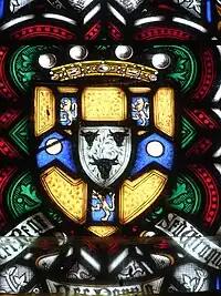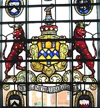 Heraldic achievement of Lord Rolle (died 1842) in first-floor window at top of grand staircase, Bicton House. Motto: Nec Reg(in)a Nec Populo Sed Utroque ("Not with the Queen, not with the People, but with each"). Arms: Or, on a fesse indented azure between three billets of the second each charged with a lion rampant of the first three bezants. The canting crest is a dexter cubit arm holding in the hand a roll of parchment, the crests of earlier family members hold a baton (Chittlehampton Church) or a flint-stone (Library Room, Stevenstone). Sable, a chevron between three hands grasping a stone argent were the canting arms of the mediaeval de Stevenstone family of Stevenstone