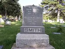 Smith was involved in plural marriage and had two wives.[2]: 127 Smith's first wife was Hellen Maria Fisher. She was born on September 20, 1835, in Pennsylvania. Smith and Fisher married on December 25, 1853.[4]: 99 She died on September 3, 1907. Hellen was outspoken about her lack of enthusiasm for plural marriage which was a highly encouraged practice by the LDS Church at the time.[4]: 99 Brigham Young encouraged Smith to marry another woman, which Smith obeyed five months later. Smith married twenty-three year old Nancy Melissa Lemmon on February 18, 1857. Lemmon was born in Illinois on September 6, 1833, and died on March 29, 1915.[4]: 100 After the death of Hellen, Joseph Smith III wrote to Smith stating that he was not surprised that Smith had not remarried, because he and Hellen had been married for a long time. Smith responded, admitting that he had been lonely since the death of Hellen, but that it would be difficult to find a substitute for Hellen since they had been married for nearly 54 years. In his letter to his cousin, Smith made no mention of Melissa to whom he was still married.[2]: 143 Smith had nine children with Hellen Fisher.[4]: 100 Smith had one child with Melissa Lemmon.[4]: 100