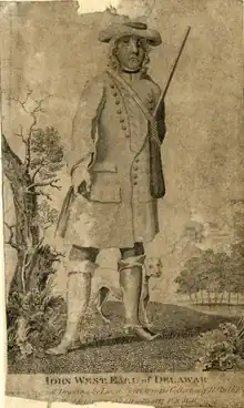 Lieutenant-General John West, 1st Earl De La Warr KB PC FRS (4 April 1693 – 16 March 1766), styled The Honourable John West until 1723 and known as The Lord De La Warr between 1723 and 1761, was a British soldier, courtier and politician who sat in the House of Commons from 1715 to 1722.