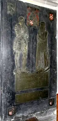 Sir John Wyndham was one of the heirs to the large fortune of his uncle Nicholas Wadham and helped to put into effect his plans for the founding of Wadham College. Sir John Wyndham also erected similar brasses, but much smaller, in St Margaret's Church, Felbrigg, Norfolk, to his cousin Thomas Windham (d. 1599) (in the nave), from whom he inherited Felbrigg Hall, and to Thomas's sister Jane Coningsby (d. 1608) (in the chancel). The inscriptions in accomplished verse on all these monuments are believed to have been written by Wyndham himself.[1]