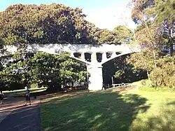 The Johnstons Creek sewage aqueduct was completed in 1897 and is a major and visibly strong component of the Northern Main Sewer extension of the Bondi Ocean Outfall Sewer. The aqueduct arches and carrier are one of the first major constructions undertaken using reinforced concrete in NSW and one of the first in Australia. The slender proportions of the supporting arches and sewage carrier along with its historic technological value are a major landmark for Sydney. The aqueduct is a major element of the historic built environment of the local area, and a long held part of the recreational reserve . The significant elements are its location within a park setting, technology of construction and past and ongoing use.[1]