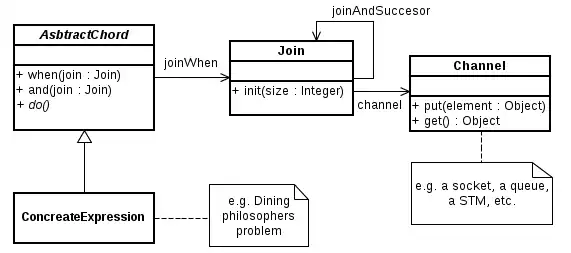 The join-pattern (or a chord in Cω) is like a super pipeline with synchronisation and matching. In fact, this concept is summarise by match and join a set of message available from different message queues, then handles them all simultaneously with one handler.[1] It could be represented by the keywords when to specify the first communication that we expected, with the and to join/pair other channels and the do to run some tasks with the different collected messages. A constructed join pattern typically takes this form:
