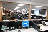 The Joint Operations Center (JOC), dedicated a month and a half prior to the official activation of the JFHQ, is the command and control center at the heart of the JFHQ. The JOC is housed in a newly renovated building at Ft. McNair, designed with the latest in technological advances for its time. The JOC boasts 50+ work stations, complete with secure and non-secure capability by way of phones, computer network access, and video teleconferencing for the entire center. The JOC is also "red phone" capable, Geospatial Information System ready, and fully integrated into the secure NORTHCOM communications system. In addition to the ability to communicate with various civilian and military units within the NCR, satellites provide the JOC with secure communication links to the Mobile Command Center and its smaller mobile cousin, "Dagger."[6]