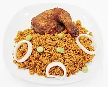 Jollof (/əˈlɒf/), or jollof rice, is a rice dish from West Africa. The dish is typically made with long-grain rice, tomatoes, chilies, onions, spices, and sometimes other vegetables and/or meat in a single pot, although its ingredients and preparation methods vary across different regions. The dish's origins are traced to the Senegambian region.
