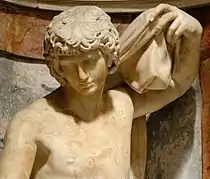 The head of the statue may have been inspired by the famous Antinous Farnese, an ancient Roman statue of Antinous, the lover of Hadrian, who committed suicide in Egypt. This is another, although less obvious, allusion to Egypt in the chapel besides the pyramidal tombs and the lotus cymatium of the entrance arch.[4]