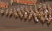 The Jordanian Armed Forces Band (Arabic: فرقة القوات المسلحة الاردنية) is the main musical unit of the Royal Jordanian Army made up of musicians who perform in official settings usually in the presence of the Jordanian royal family. When performing, all band members wear red and white checked Keffiyehs alongside their full dress uniform.[1] The band was established in 1921, with a core of 10 musicians who served with the Arab Army. In 1929, bagpipes from the area that is now Egypt and Syria were first introduced to the band.[2] In 1982, Hussein of Jordan approved the use of the band for purely ceremonial purposes. Today, the full band is composed of over 500 musicians who are arranged in a similar fashion to the Bands of the Household Division.[3][4][5][6]