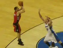 Toronto continued to deploy Ford and Calderón in tandem for the point guard position to good effect. Ford was injured for several games in November and December and the Spaniard stepped in with impressive performances.[9] In three games against the Memphis Grizzlies, Cleveland Cavaliers and Chicago Bulls, Calderón provided 37 assists while committing only three turnovers.[10] 14 games into the season, he was also leading the league in assist-to-turnover ratio with 5.67 to 1,[11] but even so, he said: "But how I feel about the team right now is that we need T.J. Ford [for the next game]."[12] 35 games into the season, the Spaniard increased the turnover ratio to 6.15 to 1, setting him on course to break an NBA record (he went to end the season as the league-leader with 5.38 to 1).[13][14] He shot at least 50% on field goals, 40% on three-pointers, and 90% on free-throws, and is sometimes listed as a member of the NBA's 50–40–90 Club, even though he was sixteen free-throws shy of attaining the NBA league minimum number of makes in this category. By mid-season, he was touted as a possibility for making the All-Star reserve team.[15] Even after Ford returned from injury for the final third of the campaign, Calderón was able to keep his place in the starting lineup. Ford had initially agreed to playing backup, but reportedly became frustrated at not being able to start.[16] Calderón eventually asked the coaching staff to play Ford as starter instead, leading to widespread praise from the coaching staff, teammates, and fans. Given that he was going to become a free agent by the end of the campaign, there were even calls for Ford to be traded so that the team could be built around Calderón as point guard.[16] By the end of the regular season, Calderón was fifth in the league for assists per game,[14] and in the 2008 NBA Playoffs, Ford split the playing time with him about equally, with the two players combining for averages of 23.4 points and 13.6 assists per game.[5][17] However, the Raptors were eliminated by the Orlando Magic in the first round four games to one.[18]