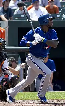 Reyes was held out of baseball activities for several weeks before playing two innings in a simulated game on June 14.[39] He then began a rehab assignment in High-A Dunedin. Reyes played in 3 games and recorded a .417 average with 3 runs scored, 1 RBI and 1 stolen base.[40] Reyes was promoted to Triple-A Buffalo on June 21, and scored the winning run against the Durham Bulls.[41] After playing three games in Buffalo, Alex Anthopoulos said Reyes would play another game in Buffalo, followed by a game in Double-A New Hampshire. The plan was for Reyes to then be called up on June 27 when the Blue Jays begin a 4-game series against the Boston Red Sox,[42] however it was later reported that Reyes would be called up one day earlier.[43] Reyes went to Tampa Bay on June 25, rather than going to New Hampshire and was present in the dugout, despite not being able to play. He went 0–4 in his return to the lineup on June 26, but the Blue Jays won on R. A. Dickey's complete game shutout 3–0.[44] Reyes recorded his first hit since coming off the disabled list on June 28 against the Boston Red Sox. The hit was also his 1,500th career hit. Reyes played his first game at home since coming off the disabled list on Canada Day and went 3–5 with a solo home run.[45] On August 2, in a 7–5 loss to the Los Angeles Angels of Anaheim, Reyes recorded his 500th career RBI on a two-run home run. In a game against the Seattle Mariners on August 6, Reyes hit his 100th career home run, a solo shot to lead off the game off of Félix Hernández.