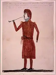 His shoulder bag is in the British Museum.[18] Also in the British Museum are "a long hunting shirt of deer skin, moccasins, leggings and a belt".[2]:3 The following spring he received £200 of "clothing and agricultural implements" of which a list has survived.[16]:94–95[7]:404