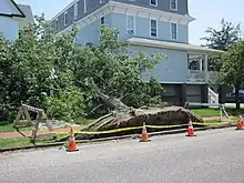 In South Jersey, Atlantic City Electric reported that 206,000 customers lost power from downed trees. Most of the outages were in Atlantic County, which prompted a county-wide state of emergency. Near Atlantic City, a boater died while trying to bring his vessel ashore. Officials believed that lightning struck a 104-year-old church in Longport and caused a fire that damaged the building.[38] Two boys were killed when a tree fell on their tent in Parvin State Park.[39] In Vineland, damage was preliminarily estimated at $125 million.[40] On July 19, 2012, President Obama declared three counties in New Jersey (Atlantic, Cumberland, and Salem) federal disaster areas. This assured disaster relief through federal assistance to local and state governments and some non-profit organizations.[41]