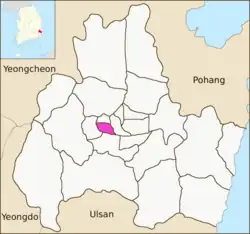 Jungbu-dong is a dong or a neighbourhood of the Gyeongju City, North Gyeongsang province, South Korea. It is bordered by Songdong-dong and Hwango-dong on the east, Seonggeon-dong on the west, Hwangnam-dong on the south and Hwangseong-dong on the north. Its 0.93 square kilometers are home to about 6,894 people. It is an administrative dong that consists of five legal dongs such as Seobu-dong, Dongbu-dong, Bukbu-dong, Noseo-dong, and Nodong-dong.[1]