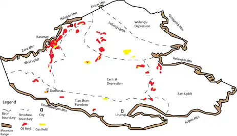 Junggar Basin contains the third-largest petroleum reservoirs in China.[3] About two-thirds of oil can be found in the Karamay-Urho monocline area.[3] There was formed in Carboniferous deep-sea sedimentary rocks and lake sedimentary layers from Permian to Tertiary.[3][26] For Carboniferous oil and gas deposits in this area, they were moved upward and accumulated in the Permian period and Mesozoic era sandstones.[27] Then, the layers altered as the structural trap locations by tectonic activities in the later stage.[27] Petroleum is dominant in Karamay, Baikouquan, Urho, Dushanzi, and Qigu.[26][3] The oil and gas fields can be found on Tertiary Dushanzi sandstone.[3][26] Besides, gas fields are found in the Karamay as well as the inland region of the basin.[25]