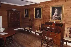 Featherbed Alley Printshop Museum, in the cellar of the Mitchell House, built c.1720, which features cedar beams, though the floor boards above are of then-more expensive, imported wood.