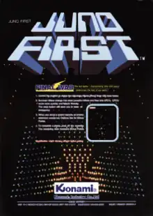 Juno First (ジュノファースト) is an arcade video game developed by Konami and released in 1983. It was licensed to Gottlieb in the United States. Juno First is a fixed shooter with a slightly tilted perspective, similar to Nintendo's Radar Scope from 1980.[1] The game was ported to the Commodore 64, Atari 8-bit family, MSX, IBM PC, and IBM PCjr.