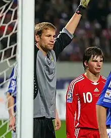 In October 2006 he saved two penalties in one match from Blackburn Rovers' Benni McCarthy and Jason Roberts to secure a 1–0 away win.[4] On 13 May 2007, Jääskeläinen received Bolton's "Player of the Year Award" and also the "Players' Player of the Year Award" after helping Bolton secure a UEFA Cup spot for only the second time in their history.[5] Despite much speculation linking him with a move away from Bolton when his contract expired following the 2007–08 season, Jääskeläinen agreed a new four-year contract on 11 June,[6] which he signed on 9 July.[7]