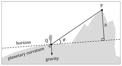 where e is the summit's elevation angle. Height, angle-reduced height, and jut have unit of length (meter or feet). While height and angle-reduced height depend on the viewing location around the peak, jut is a constant value for a given peak.[1] Base is the location where angle-reduced height is maximized.