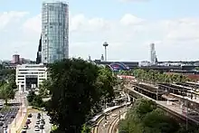 S-Bahn platform with a view of Cologne Cathedral (left) and Colonius telecommunications tower (right)