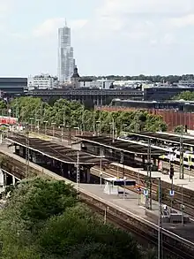Köln Messe/Deutz is a junction station, which has platforms on two levels: the high-level platforms are used by trains running in the east-west direction across the Hohenzollern Bridge to and from Köln Hauptbahnhof. The lower level (Köln Messe/Deutz tief) is used by trains running in a north-south direction bypassing the Hauptbahnhof between Köln-Mülheim station and Troisdorf.[7] It serves an important function in providing some relief for the Köln Hauptbahnhof bottleneck—some ICE services call at Köln-Deutz instead, eliminating the need for changing direction, while many regional trains from the west terminate here.[8]