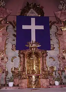 The right side altar is consecrated to the church's second patron, Saint Catherine. The broken wheel is a reference to her martyrdom. Catherine is shown wearing a crown, for according to legend, she was from a royal family. She is flanked by Saint Ottilie and Saint Margaret. Ottilie regained her eyesight after baptism and is said to be the patron protectress of the blind, to which the book with the pair of eyes alludes. Above the retable with the dove, the symbol for the Holy Ghost, stands the figure of Saint Sebastian with arrows stuck through him.