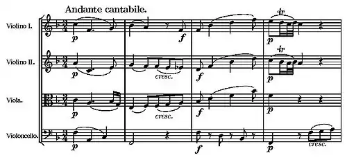 Listen) to use chromatic and whole tone scales to outline fourths. Arch shaped lines emphasizing fourths in the first violin (C – F – C) and the violoncello (G – C – C' – G') are combined with lines emphasizing fifths in the second violin and viola. Over the barline between the second and third measures of the example, a fourth-suspension can be seen in the second violin's tied C. In another of his string quartets, KV 464, such fourth-suspensions are also very prominent.