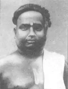 K. C. Kesava Pillai[note 1] was born on February 4, 1868, in Paravur in Kollam district of Kerala in India to Valiyavelichathu Veettil Raman Pillai and Desathu Lakshmy Amma.[2] His early schooling was at Paravur Malayalam School where he studied up to 5th standard and followed it up with Sanskrit studies under the tutelage of Paravur Kesavan Asan and grammar studies under Enakkattu Rajaraja Varma.[3] As a boy, Pillai regularly watched Kathakali and learnt the basics of Kathakali literature, costumes and mudras, besides gaining proficiency in music. Aged 15, he wrote his first attakadha, Prahladacharitham.[4] Simultaneously, he studied English with the help of a few friends while working as a Sanskrit teacher at a Vaidya School. In 1897, he joined as a Sanskrit teacher at a Malayalam school in Kollam but shifted to an English school in 1901 before moving to Thiruvananthapuram in 1901 as the teacher of Velayudhan Thampi, the son of Sree Moolam Thirunal, the then Maharajah of Travancore.[2]