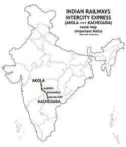 The Akola–Kacheguda Intercity Express is an Express train of South Central Railway zone, which runs between the cities of Akola, the major industrial & agricultural city of Maharashtra and Hyderabad, the capital city of Telangana, India. The train primarily runs on Secunderabad–Manmad section.