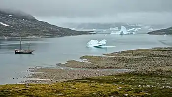 The Kalaallit Nunaat high arctic tundra ecoregion covers the coastal areas of northern including the upper half of the west coast and the upper one-third of the east coast.[1] Greenland (called Kalaallit Nunaat in the Greenlandic language). Areas inland of this strip of land are either covered in ice or bare rock. About one-third of the region is covered by mosses and lichens, and another 3% by herbaceous vegetation and shrubs. The largest national park in the world, Northeast Greenland National Park, protects a majority of the land within the ecoregion.[2][3][4][5] The Pituffik Space Base is also located in this ecoregion.[6]
